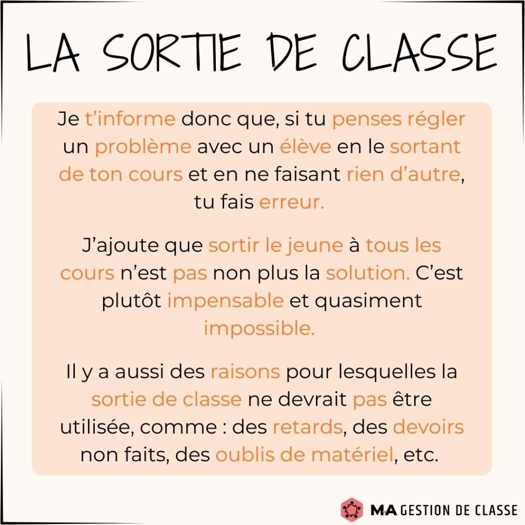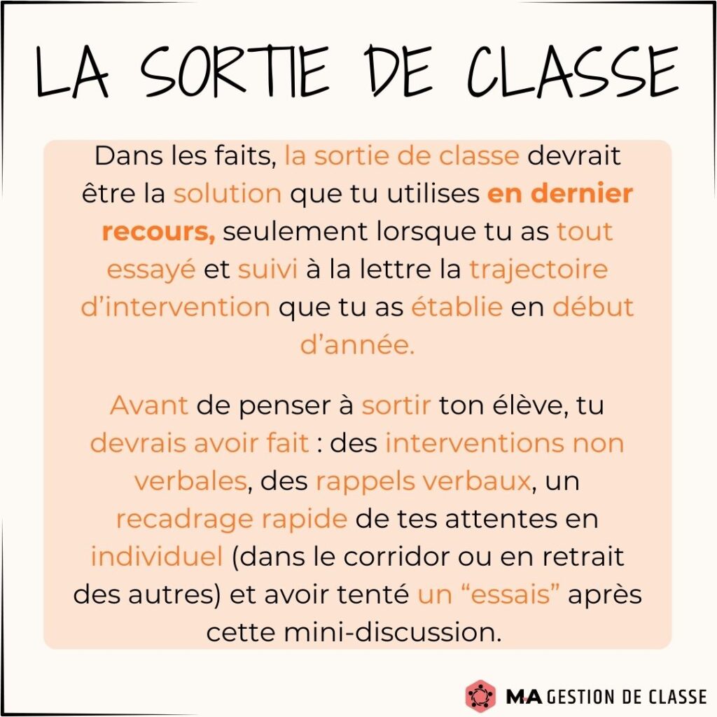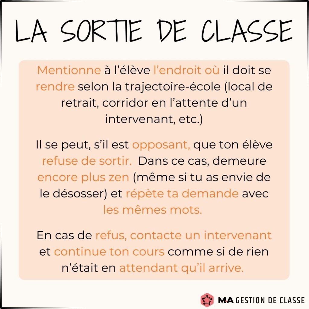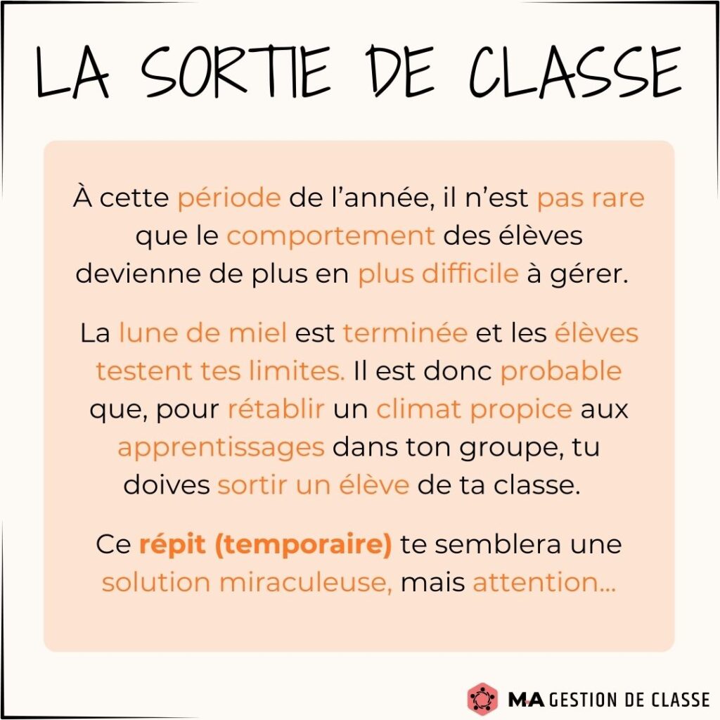Avez-vous commencé à gérer certains comportements indésirables ? Avez-vous été obligé d’utiliser la sortie de classe avec un élève ? Il est normal dans les prochains temps que votre gestion de classe se complique un peu et qu’elle vous demande plus d’énergie. Les élèves vont vous tester. Vous vous demanderez peut-être si vous devez sortir un élève de classe. Voici quelques conseils et stratégies sur ce moyen, afin que vous l’utilisiez de manière efficace.
