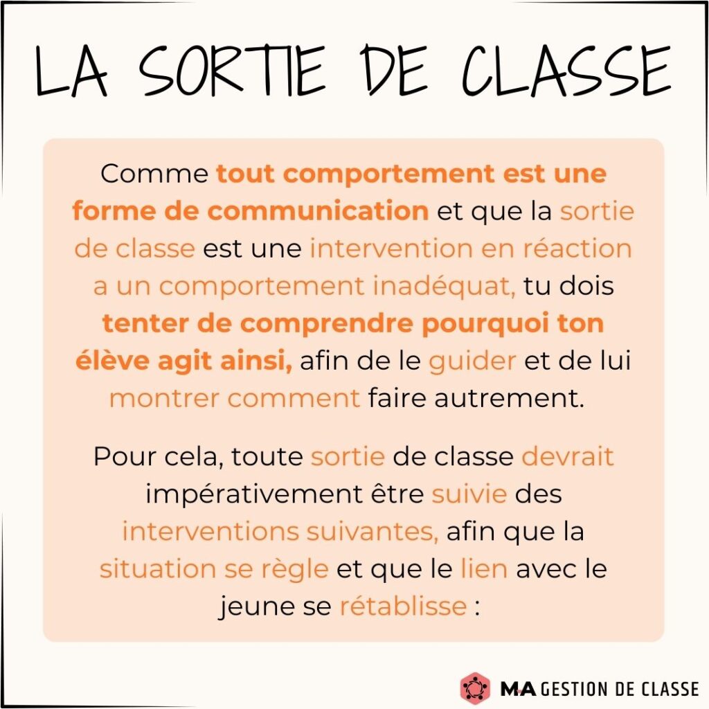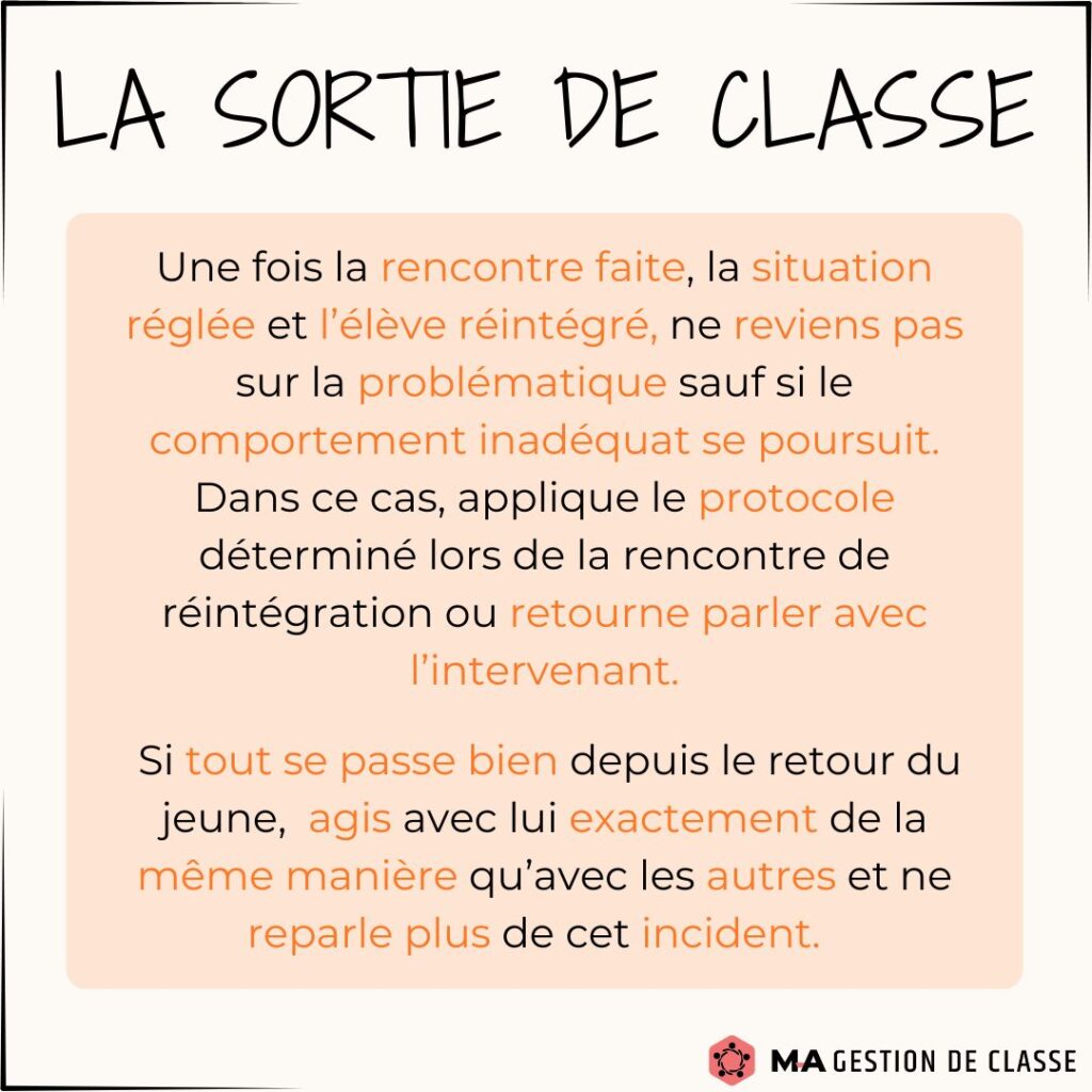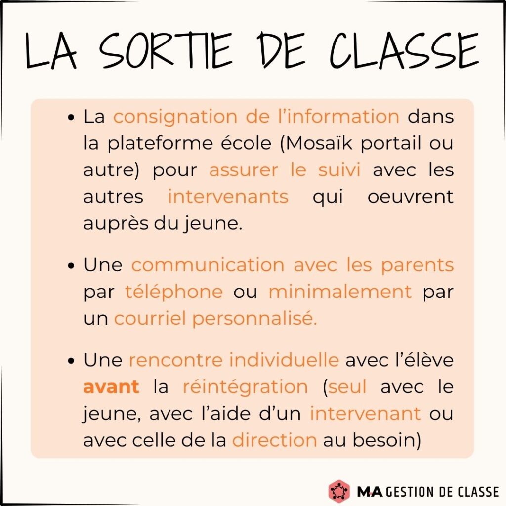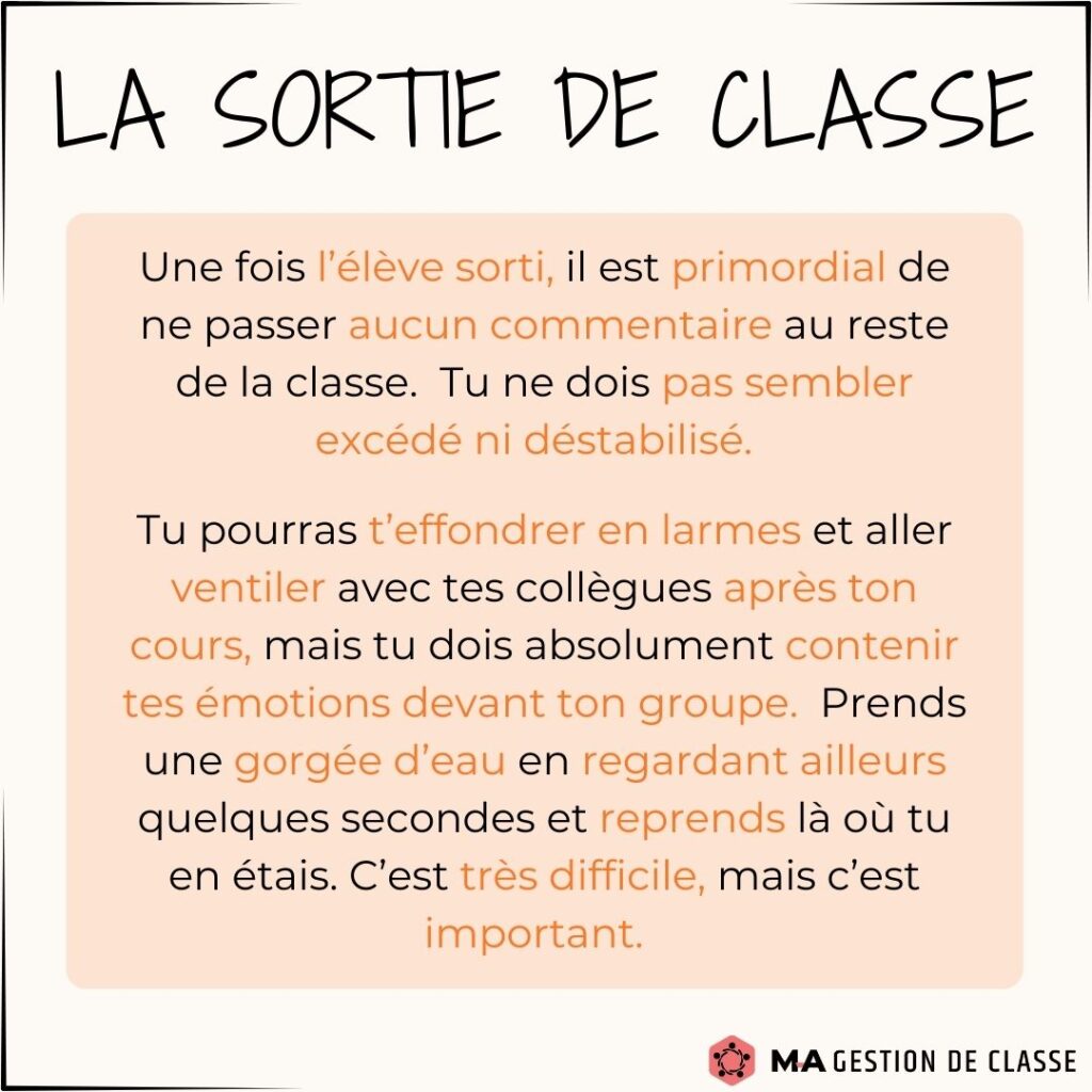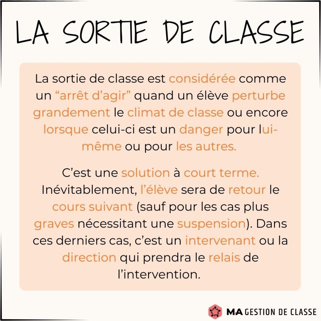 Avez-vous commencé à gérer certains comportements indésirables ? Avez-vous été obligé d’utiliser la sortie de classe avec un élève ? Il est normal dans les prochains temps que votre gestion de classe se complique un peu et qu’elle vous demande plus d’énergie. Les élèves vont vous tester. Vous vous demanderez peut-être si vous devez sortir un élève de classe. Voici quelques conseils et stratégies sur ce moyen, afin que vous l’utilisiez de manière efficace.
